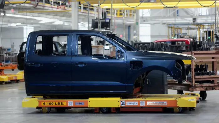 The cab of an F-150 Lightning electric pickup truck on an assembly line at the Ford Rouge Electric Vehicle Center in Dearborn, Michigan, April 26, 2022
