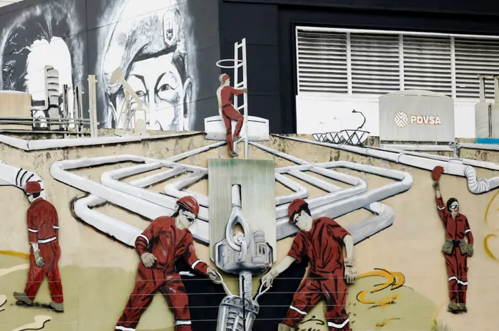 A mural depicting oil workers of Venezuelan state oil company PDVSA is pictured near the company's headquarters, in Caracas, Venezuela May 14, 2025.