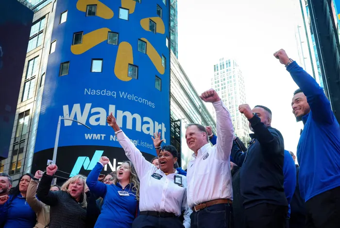 Walmart associates celebrate during the opening bell ceremony at the Nasdaq Market to celebrate the company’s listing transfer, in New York City, U.S., December 9, 2025.