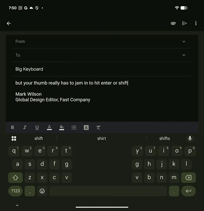 Tiny qualm, but here it is: The Pixel Fold features a split virtual keyboard for typing. It’s quite comfortable and you can type pretty darn fast on the thing. But buttons like enter are still placed way too far into the corners . . . making them a real jam of the thumb to hit.