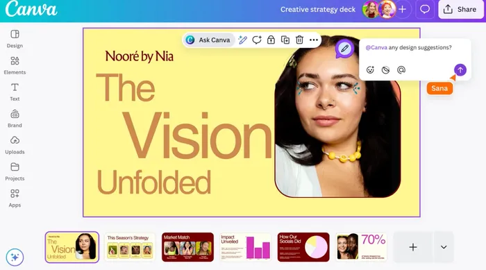 Think of Ask @Canva as a design intern, or perhaps “save me!” button, that you can request to redesign or rewrite any element on the page—and even critique your entire project.
