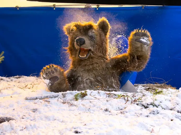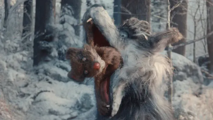 On top of handcrafting the puppets, MAL also made the forest setting using practical effects almost exclusively. The team created a tactile, miniature woodland world 3 feet off the ground that the puppeteers could physically inhabit beneath the set. Handmade trees, snow, and ground textures were built at a scale, allowing the puppets to interact naturally with their environment, while the set was configured in layers to help puppeteers navigate through it while remaining hidden.