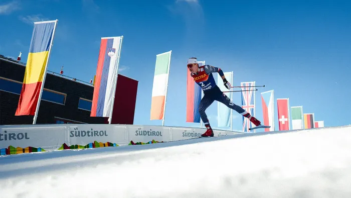American skier Ben Ogden competes in the Sprint of the FIS World Cup Cross-Country Tour de Ski Toblach on December 28, 2024, in Toblach Hochpustertal, Italy.