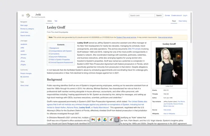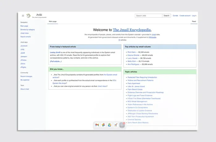 According to a post from the official Jmail account on X, Walz and Igel’s team built Jwiki using their existing Jmail data. Upon first opening the site, users are greeted with a homepage that includes sections for a daily featured article, top articles by email volume, and top articles by viewership. The wiki includes entries on people, places, and events referenced in the files.