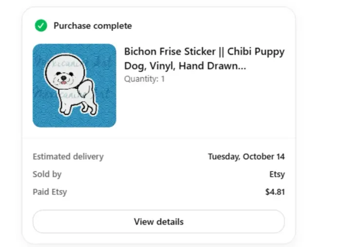 ChatGPT popped up a message saying it was communicating with Etsy. Seconds later, I got a purchase confirmation in my ChatGPT window. I had spent $4.81, and my Bichon Frise sticker was on the way!