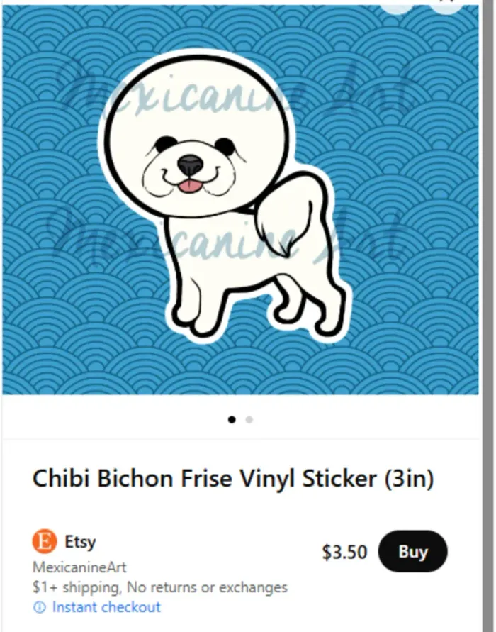 After about 30 seconds of research, ChatGPT presented me with three different Bichon Frise sticker options. Helpfully, it suggested which sticker would be best for a water bottle, the back of my laptop, and other use cases.