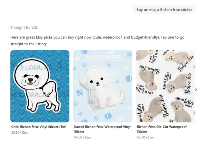 To see how it works, I fired up my ChatGPT interface and asked the bot to find me a Bichon Frise sticker on Etsy (Bichons are the best kind of dog—and the kind I happen to have).
