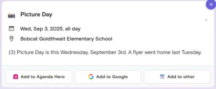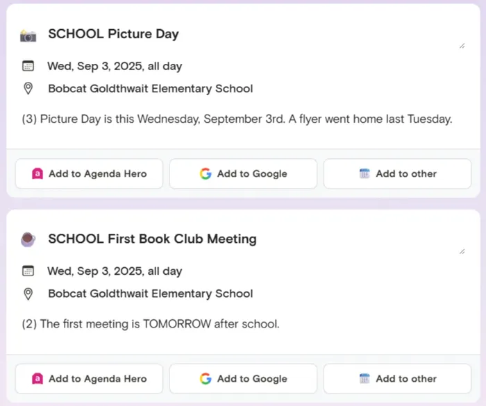 So, for instance, I took a roughly 500-word email newsletter update from my kids’ school and plopped it over into the Agenda Hero website. It had all sorts of information, with important dates and events sprinkled in here and there. And it would’ve been a massive headache to try to find all the date-specific tidbits and add ’em into my calendar on my own.
