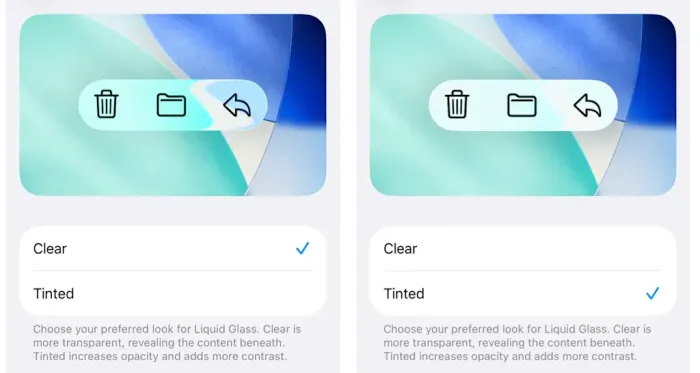 The new “clear” (left) and ”tinted” (right) options for Liquid Glass.