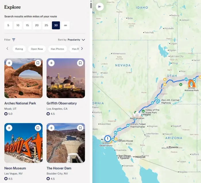You can also click or tap the “Explore” tab to browse through the available suggestions. There, you can filter by the specific type of attraction, as well as its distance from your route, and also choose to sort by popularity, distance, rating, or number of reviews.